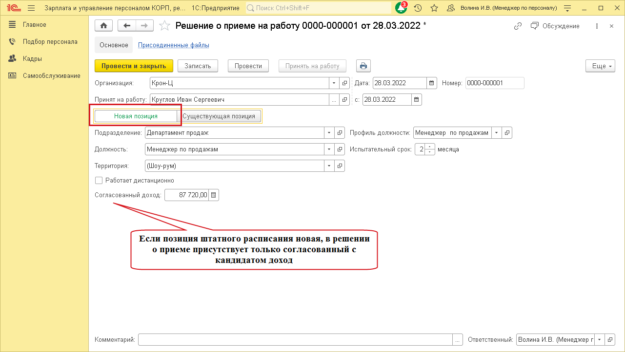 Если в Решении о приеме кандидата на работу указан прием на новую позицию, то HR указывает согласованный с кандидатом доход.