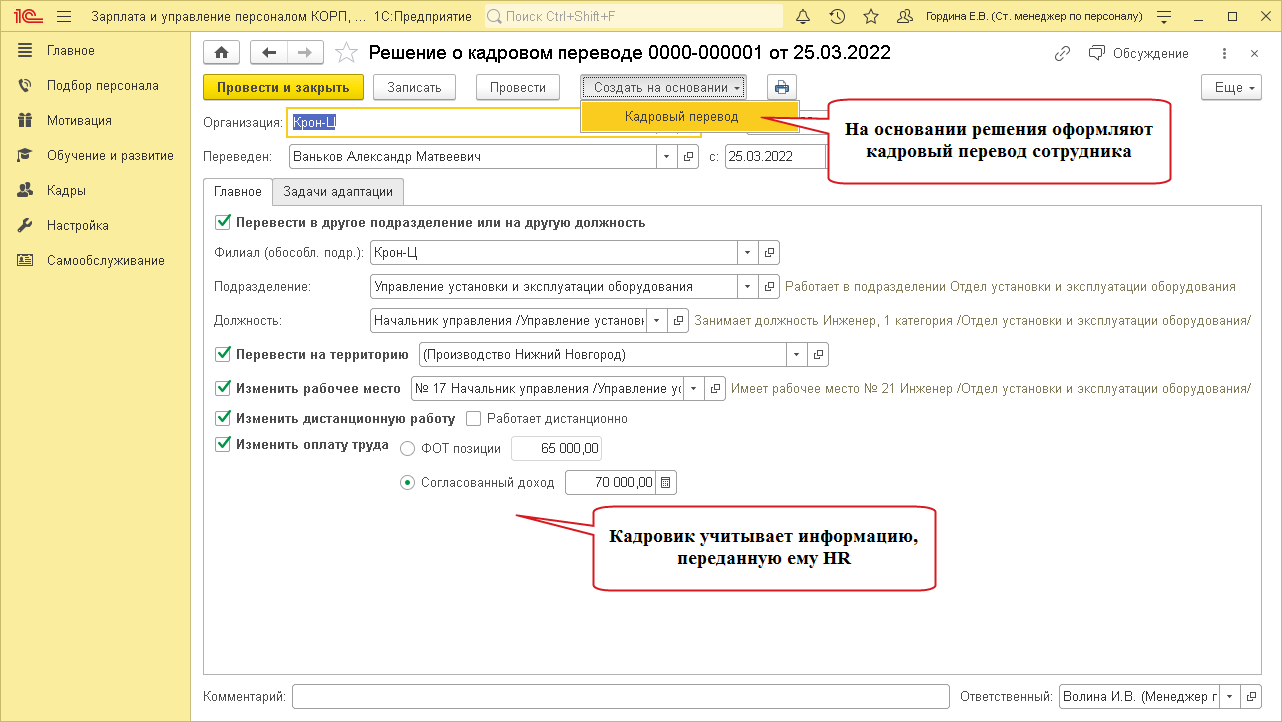 HR занимается развитием и ротацией персонала. У него есть информация о том, какое решение принято по переводу сотрудника, HR в курсе всех договоренностей. Кадровику эти данные необходимы для оформления кадрового перевода. Поэтому в 1С:ЗУП КОРП HR используют Решение о кадровом переводе, где есть возможность указать:
