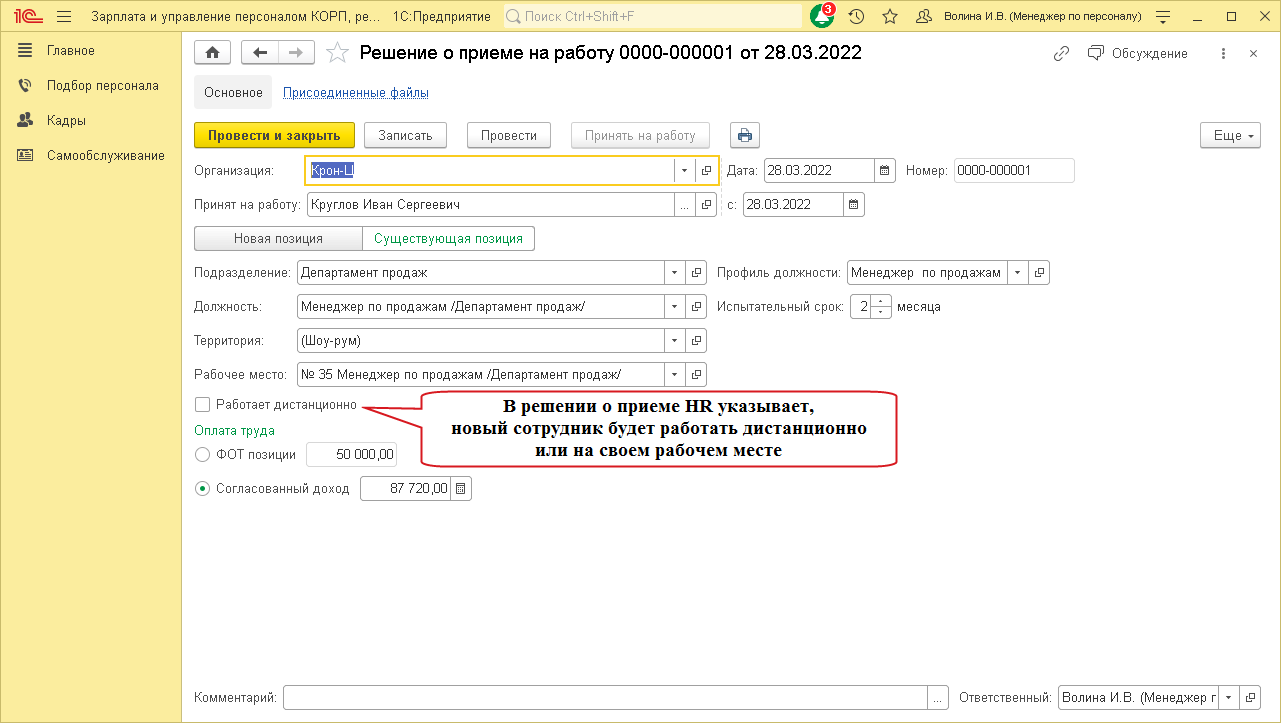 Формат работы сотрудника (дистанционно или нет) HR указывает в Решении о приеме на работу.