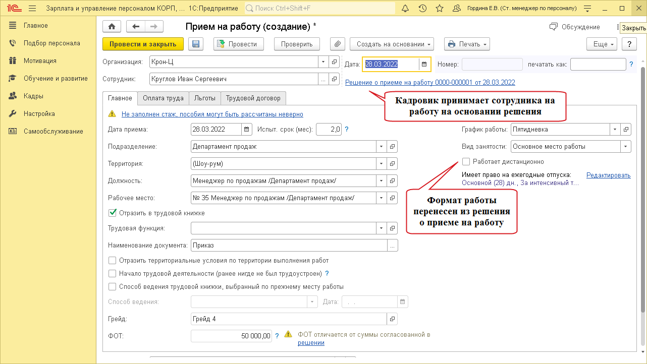 Кадровик оформляет Прием на работу на основании решения, при этом формат работы сотрудника (дистанционно):