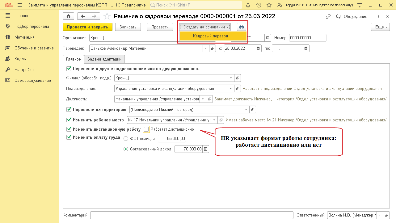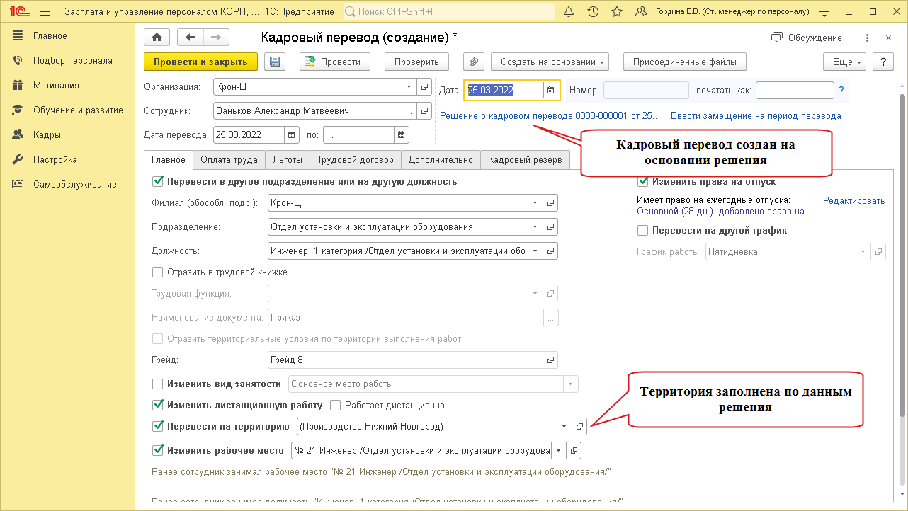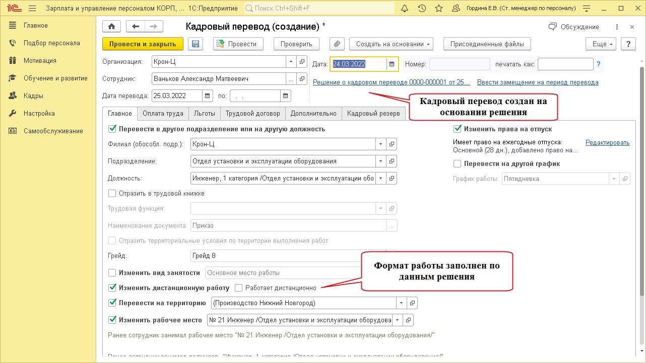 Кадровик создает на основании Решения о кадровом переводе документ Кадровое перемещение, при этом новое рабочее место сотрудника: