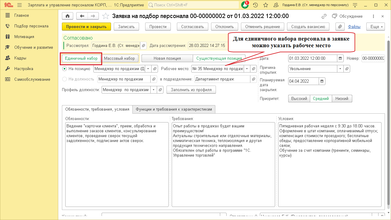 Заказчик в Заявке на подбор может указать конкретное рабочее место, на которое нужно найти сотрудника (для единичного набора).