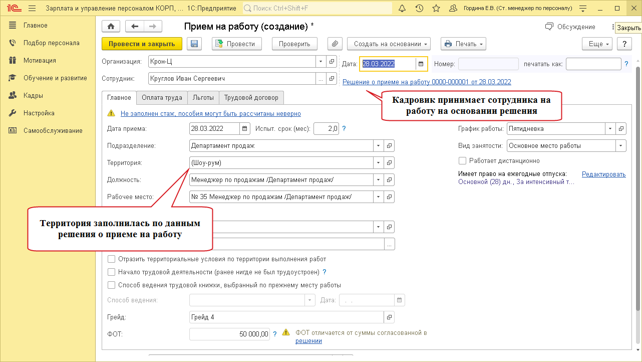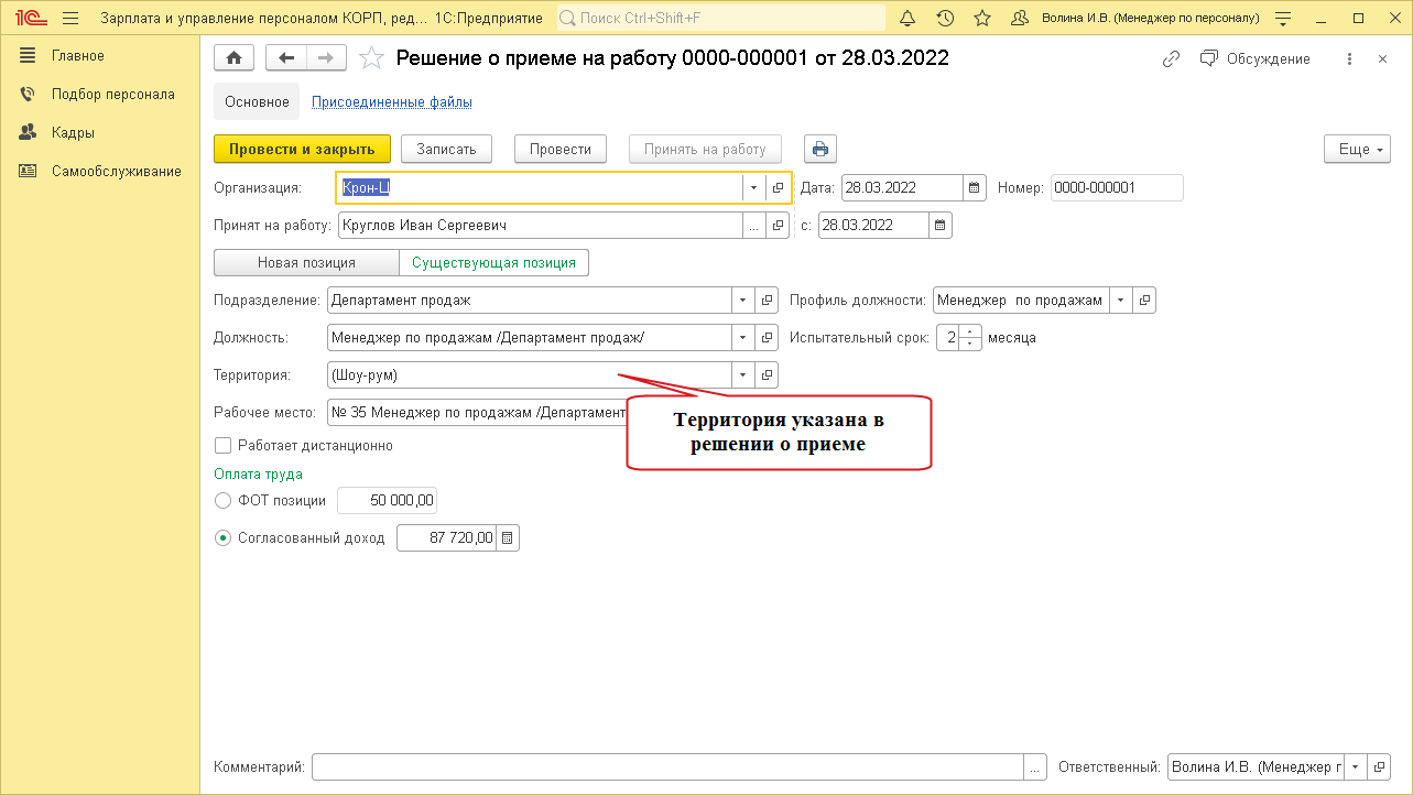 HR указывает территорию работы сотрудника в Решении о приеме на работу.
