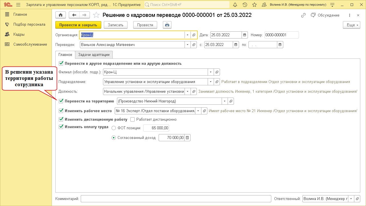 HR указывает территорию работы сотрудника в Решении о кадровом переводе.