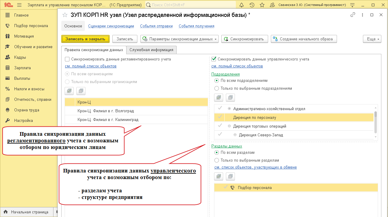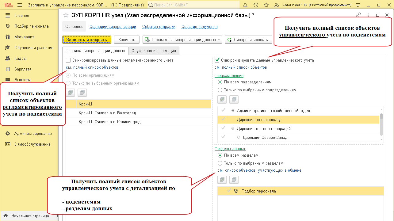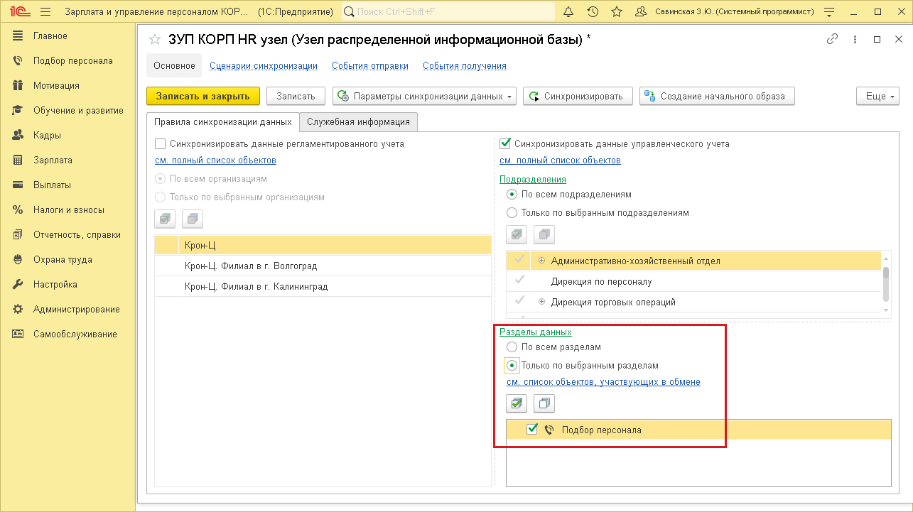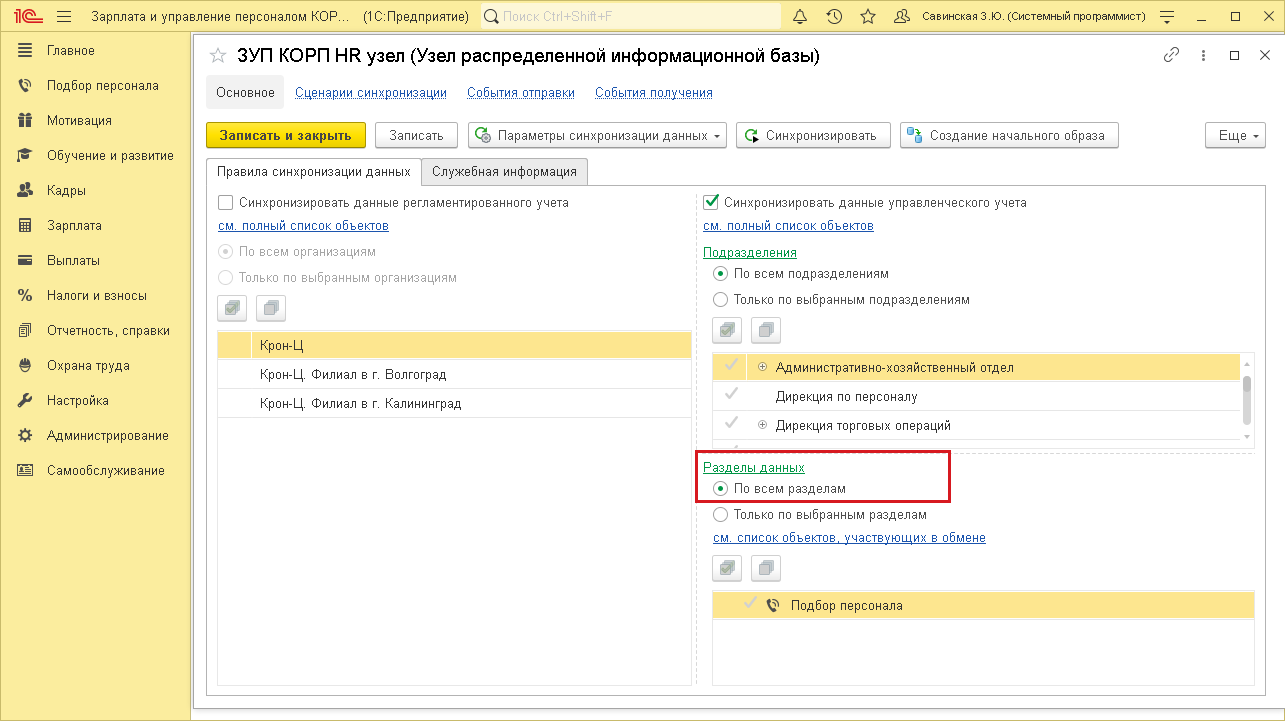 Если в настройках узла РИБ указана синхронизация только раздела Подбор персонала, то периферийный и центральный узлы будут обмениваться данными разделов управленческого учета: