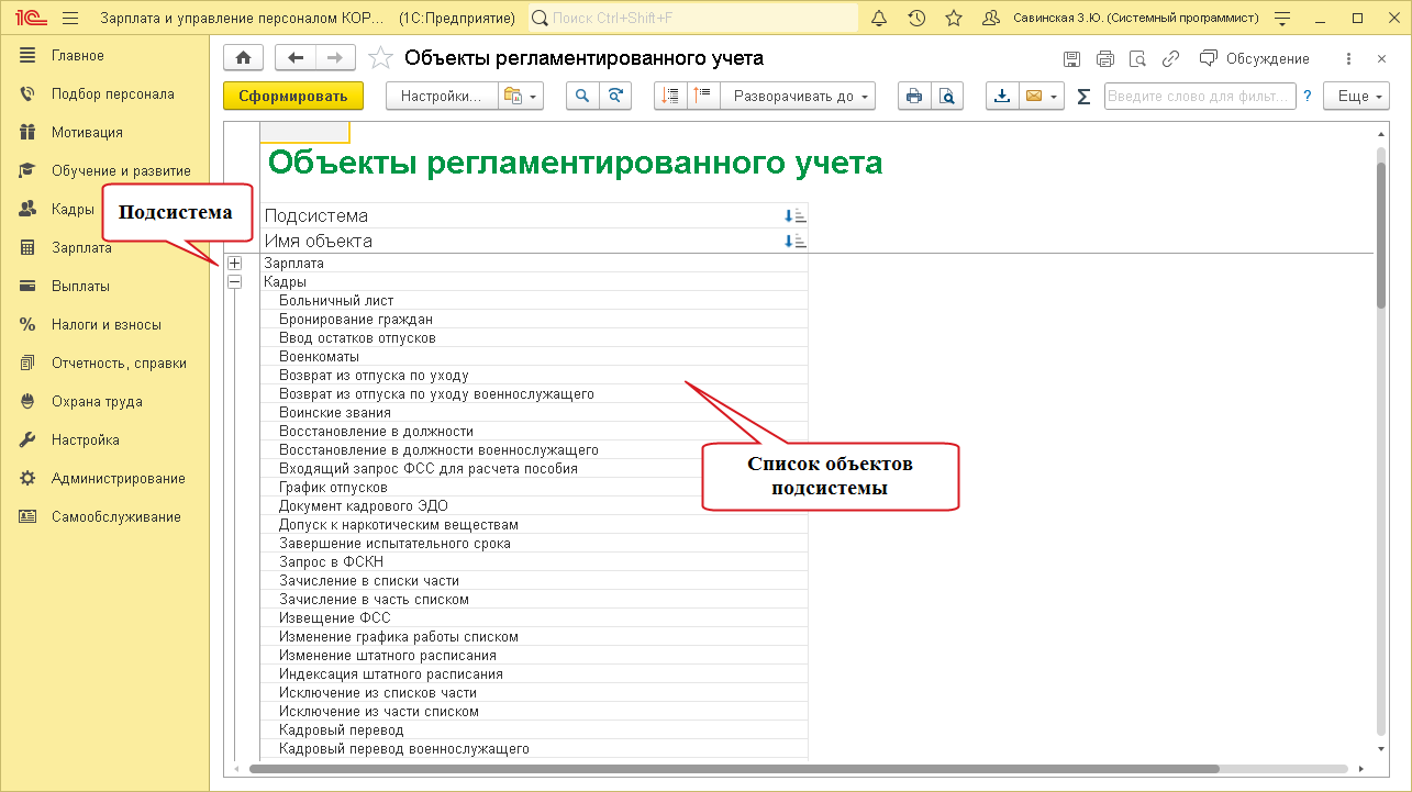 Список объектов регламентированного учета сгруппирован по подсистемам.