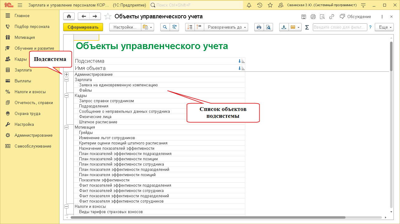 Список объектов управленческого учета сгруппирован по подсистемам, и указан раздел учета, к которому объект относится.