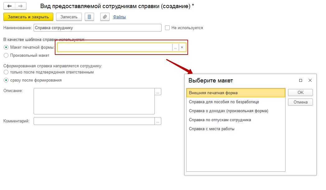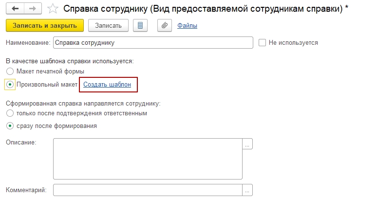 В форме справки можно заполнить описание вида справки и комментарий.