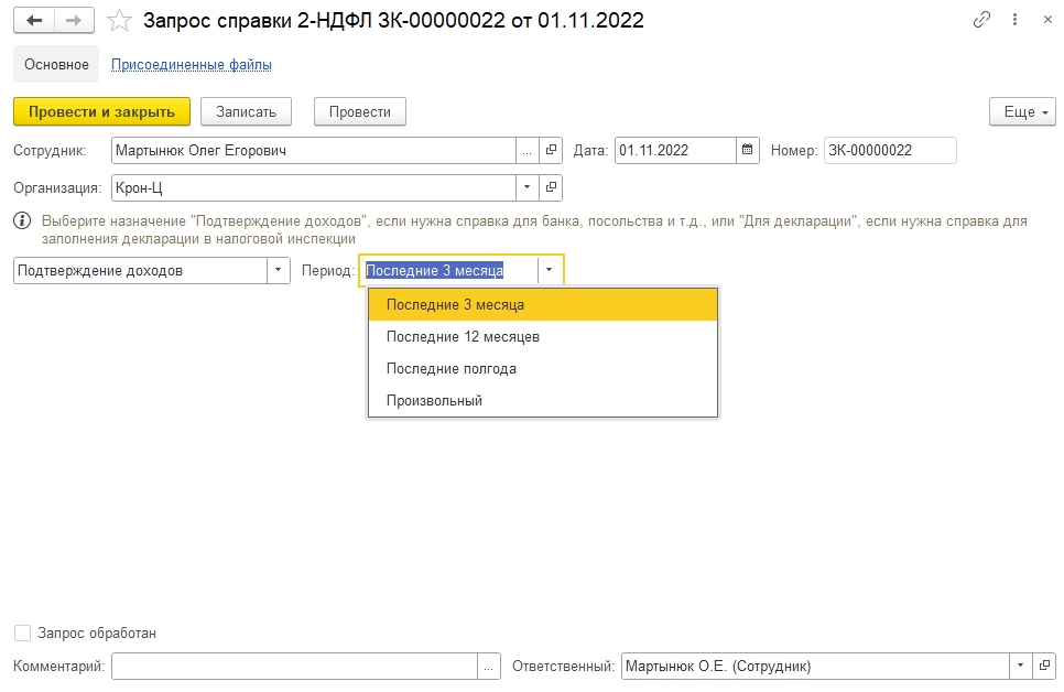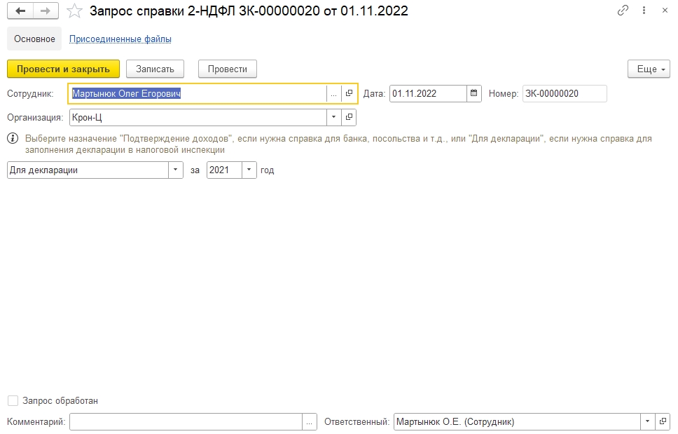 Для запроса сотрудниками справок 2-НДФЛ предназначен новый документ «Запрос справки 2-НДФЛ». Документ может быть оформлен: