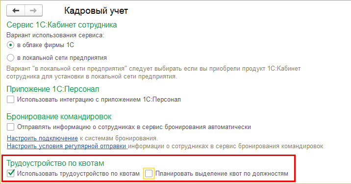 В результате мы постарались разработать гибкий механизм, сочетающий в себе оба варианта работы. В настройки кадрового учета (в самом конце) добавлен раздел "Трудоустройство по квотам".