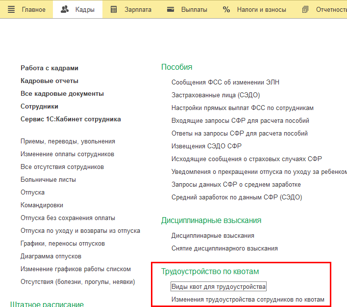 После установки флажка "Использовать трудоустройство по квотам" в разделе Кадры и в кадровых отчетах также становятся доступны разделы "Трудоустройство по квотам".