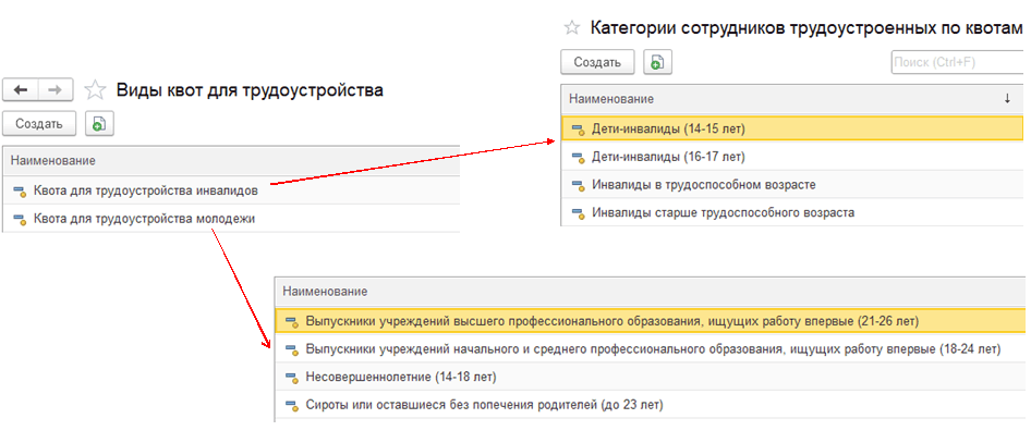 Автоматизирован учет по квотам для инвалидов и молодежи. Данные виды квот в программе преднастроены и хранятся в отдельном справочнике. И для инвалидов, и для молодежи предусмотрены дополнительные категории. Список видов квот и категорий можно расширить. Категории квоты открываются из меню "Еще" вида квоты.