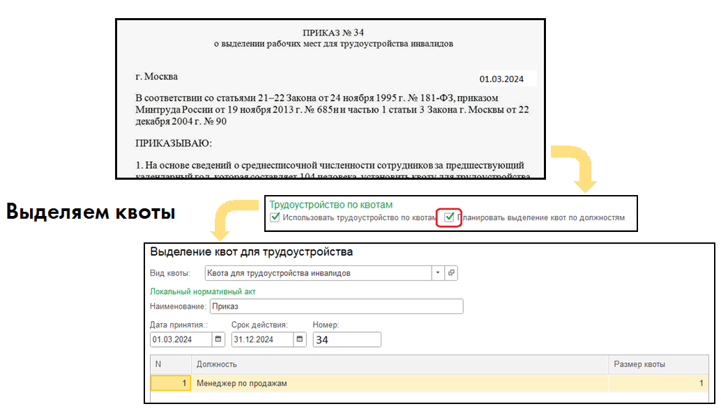 В первую очередь, работодателю необходимо утвердить локальные нормативные акты о размерах выделенных квот. Для отражения количества выделенных квот необходимо включить планирование квот по должностям и ввести документ "Выделение квот для трудоустройства". Выделение квот производится в разрезе должностей, документ может быть утвержден бессрочно, либо на произвольный период. Для каждого вида квот необходимо завести отдельный документ. Любой следующий документ по виду квоты делает неактуальным предыдущий, даже если срок его действия ещё не закончился.