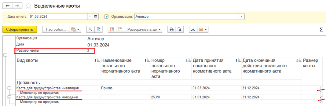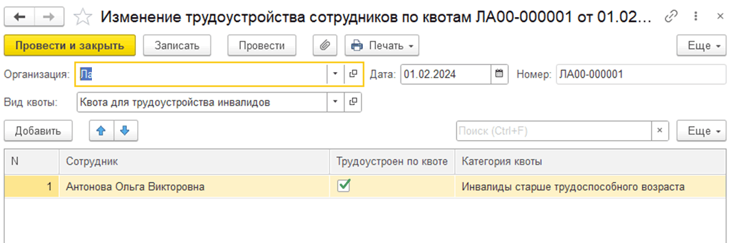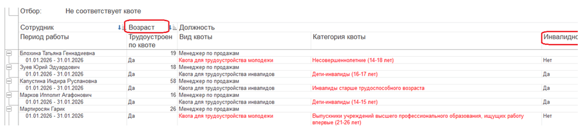 Для этого разработан отчет "Анализ учета трудоустройства по квотам", который выделяет сотрудников, занимающих квоту или категорию неправомерно.