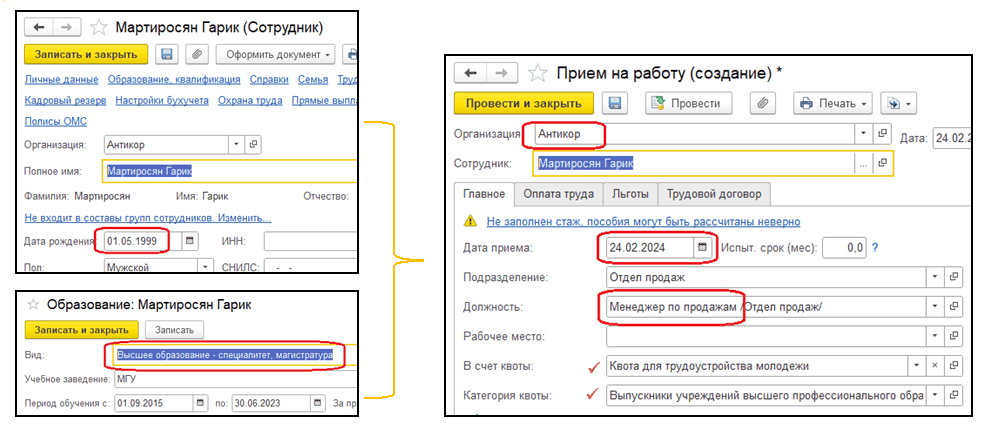 Квота по молодежи заполняется автоматически, если в карточке сотрудника: