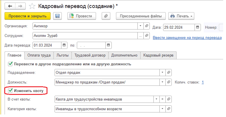 После выполнения настроек появляется возможность указать вид и категорию занимаемой квоты при приеме на работу.