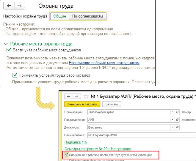 Законодательство предусматривает создание специальных рабочих мест для инвалидов. Это места, оборудованные с учетом их особенностей и потребностей. Для учета таких рабочих мест необходимо использование подсистемы "Рабочие места охраны труда". В этом случае в справочнике рабочих мест становится доступно отнесение рабочего места к специально оборудованному рабочему месту для инвалидов. При приеме на работу, либо при кадровом переводе такое рабочее место можно назначить трудоустроенному сотруднику в счет квоты.