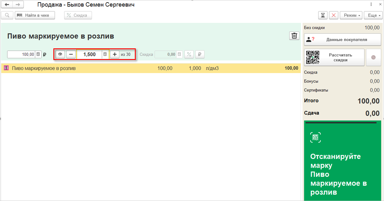 При оформлении продажи в РМК после сканирования марки кеги на этой же форме потребуется уточнить количество продаваемых литров. При этом можно указывать дробное количество, например, для продажи тары объемом в 1,5 литра. Дополнительно справа будет отображаться емкость всей кеги.
