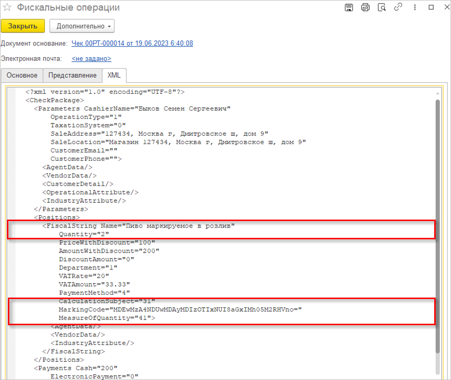 При пробитии чека заполняется код маркировки, количество и код единицы измерения.