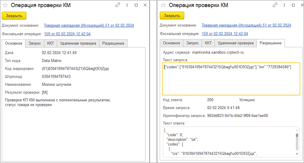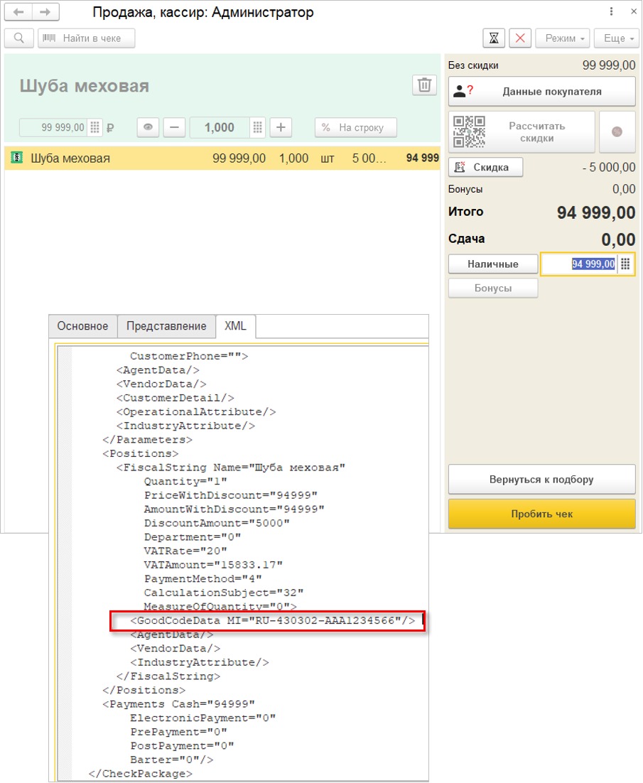 На рисунке ниже журнал кодов маркировки и фискальная операция пробитого чека.