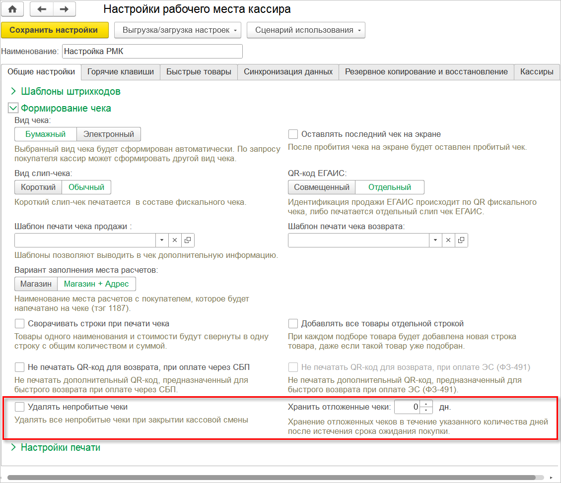 Улучшена работа с отложенными чеками. Реализовано оповещение кассира об отложенных или оплаченных, но непробитых чеках за текущую смену. При закрытии смены кассир будет видеть количество отложенных чеков. При определенной настройке можно автоматически удалять непробитые чеки при закрытии смены и указывать период хранения отложенных чеков. Для этого в меню "Формирование чека" настроек РМК предусмотрены две новых опции.