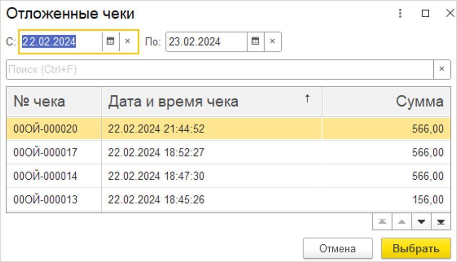При подборе отложенного чека в списке также отображаются чеки, по которым могла возникнуть ошибка или чеки с неверным статусом, но оплаченные.