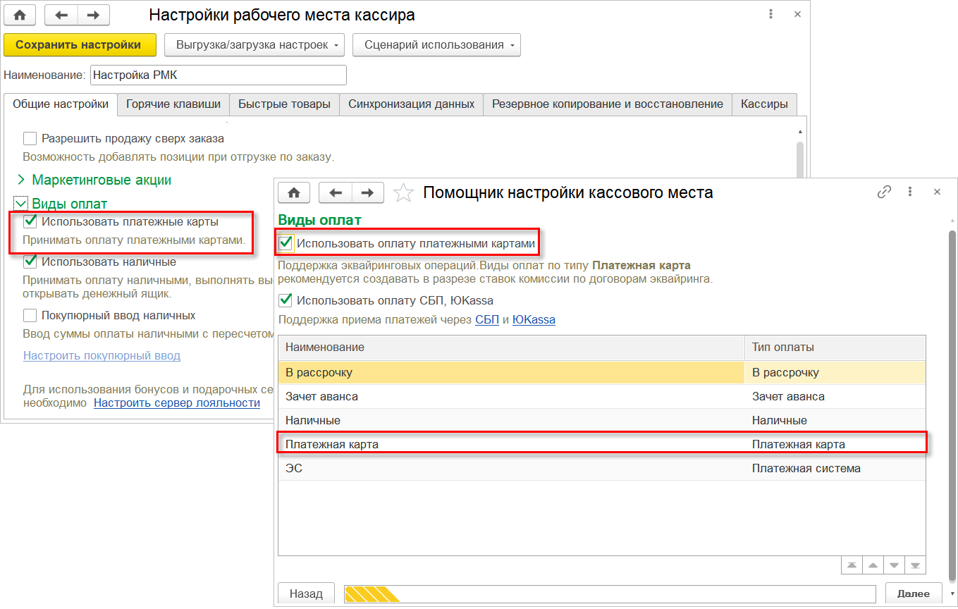 Признак использования оплаты платежными картами перенесен из функциональной опции в настройки рабочего места кассира. Теперь можно настраивать вид оплаты отдельно для каждого рабочего места, а не для всей базы целиком.
