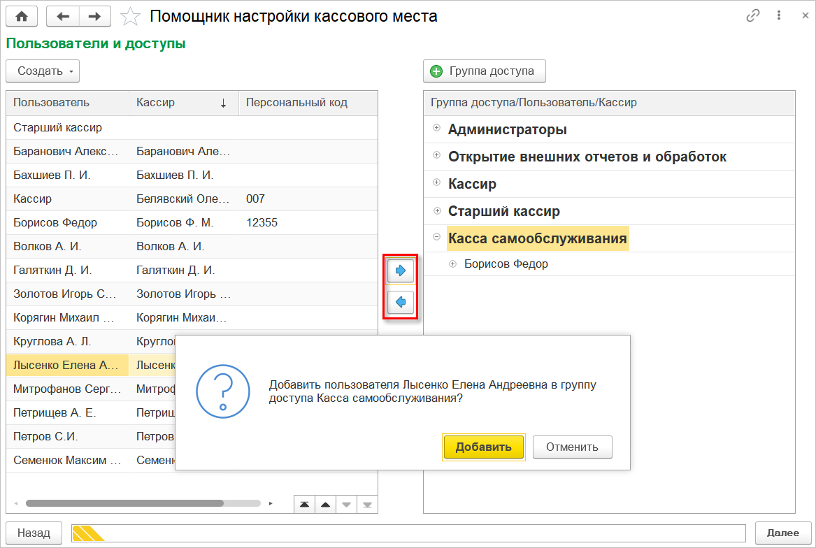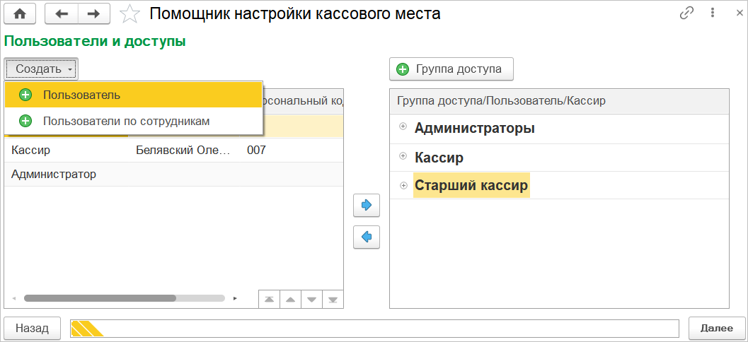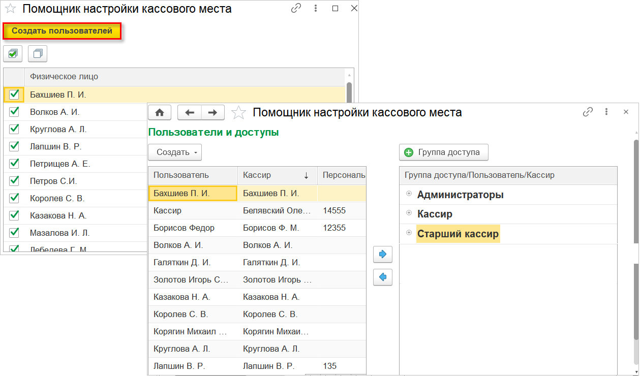 При входе в обработку «Помощник настройки кассового места РМК» автоматически устанавливается настройка «Настроить кассиров для входа», создаются группы доступа "Кассир", "Старший кассир", "Администратор". Если не используется обмен физическими лицами, то по умолчанию будут созданы и добавлены в соответствующие группы доступа пользователи "Кассир", "Старший кассир", "Администратор". Сама страница настройки пользователей разделена на две части: для создания пользователей и групп доступа. В таблице пользователей отображаются три колонки: "Пользователь" (для входа), "Кассир" (привязанный к пользователю) и "Персональный код".