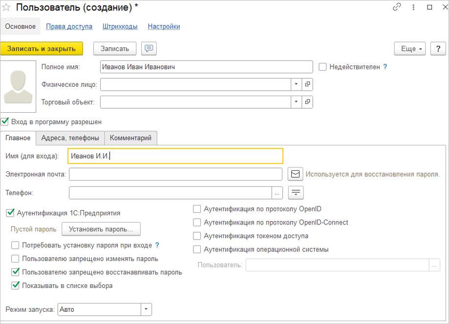 Чтобы создать пользователя необходимо в меню "Создать" выбрать команду "Пользователь", заполнить данные и сохранить изменения.