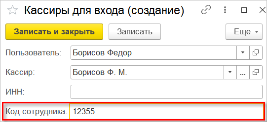 Если пользователь добавляется в группу доступа с предопределенным профилем «Кассир» или «Старший кассир», то откроется форма создания кассира. Здесь указывается группа доступа, кассир для входа, ИНН кассира и персональный код. Если код сотрудника не задан, то по гиперссылке «Сгенерировать код сотрудника» можно создать код, распечатать или отправить на почту.