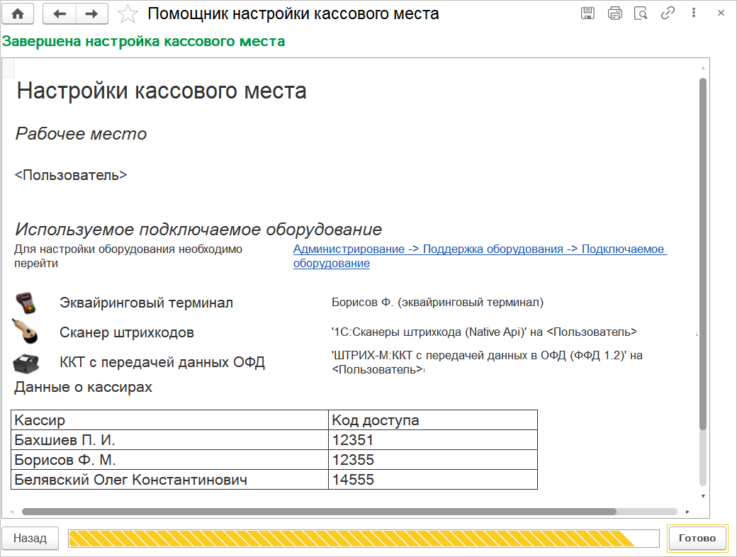 В итоговом отчете помощника будет отображаться список кассиров, с настроенными для них кодами доступа.