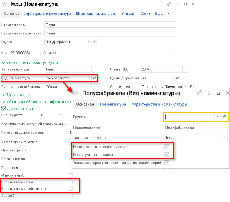 В виде номенклатуры имеются дополнительные настройки "Использовать серии" и "Использовать характеристики", которые могут отличаться от настроек позиции номенклатуры.