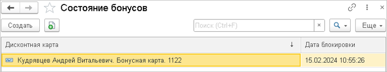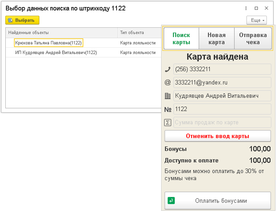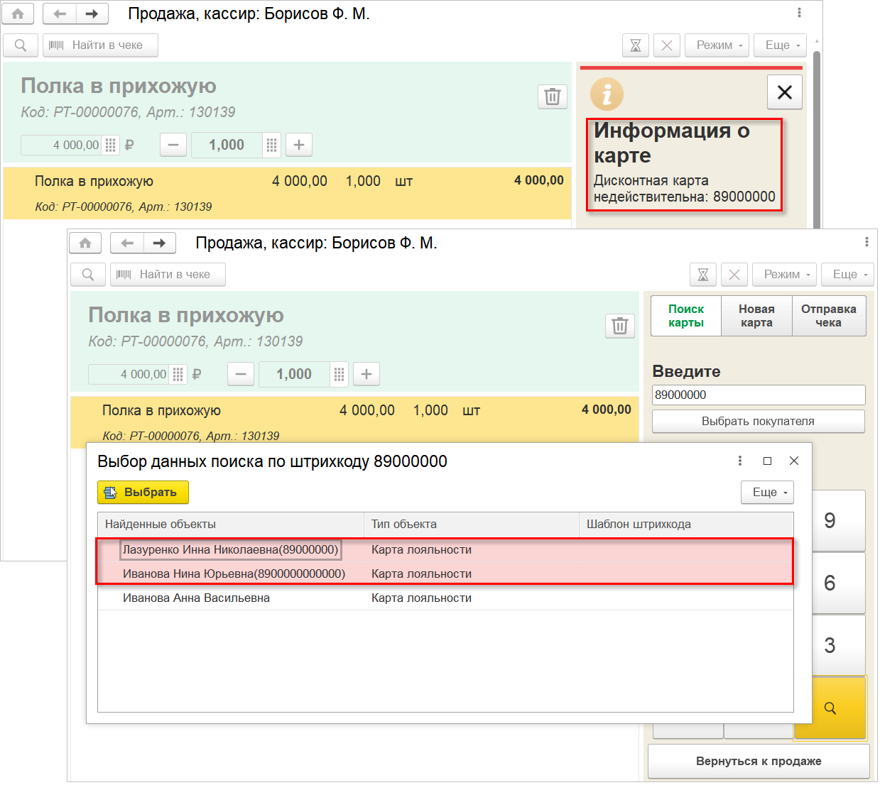 Если найдена одна карта, то информация о недействительности отобразится в стакане информации. Если найдено несколько карт лояльности, то в форме выбора недействительная карта будет подсвечена красным цветом.
