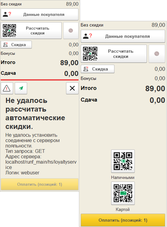 Теперь ошибки расчета будут выведены как при получении ошибки во время проверки соединения, так и непосредственно во время вызова расчета скидок. При продолжении без расчета скидок, если включен журнал действий кассира и это не администратор, происходит запись в журнал действий кассира о продолжении без расчета скидок. Дальше, если вернуться на этап ввода товаров, а затем обратно перейти к оплате, то скидки уже не будут рассчитываться для данного чека. Но расчет скидок может быть вызван нажатием кнопки «Рассчитать скидки», и если они успешно рассчитаются, то автоматический расчет скидок будет восстановлен для данного чека.