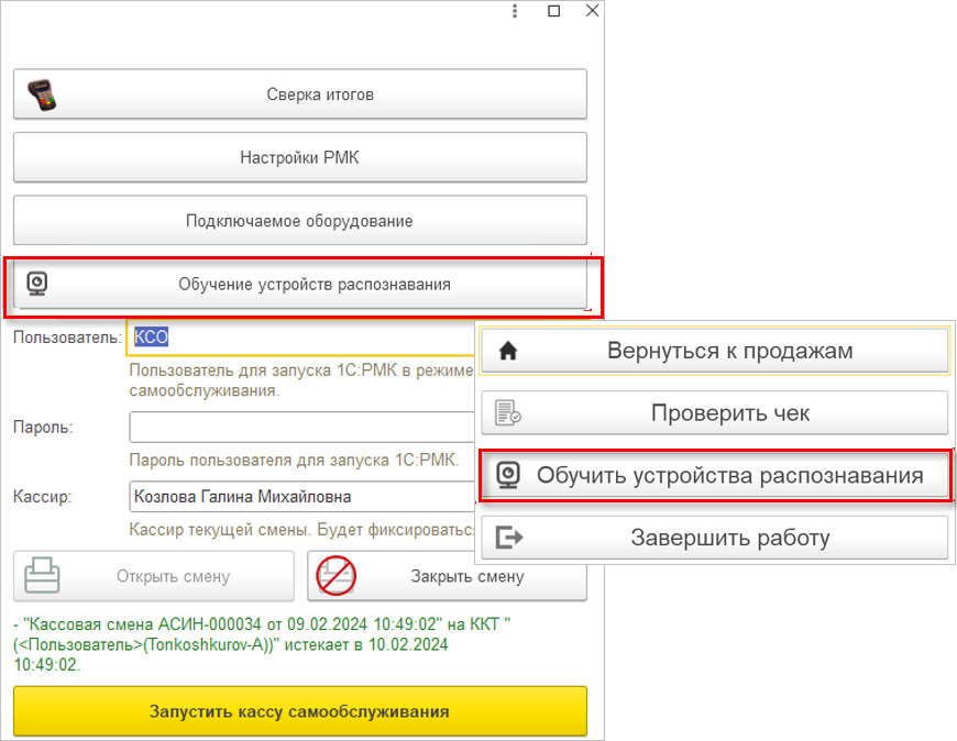 Также форму обучения устройств распознавания можно открыть из формы запуска кассы самообслуживания и из меню действий сотрудника в режиме кассы самообслуживания.
