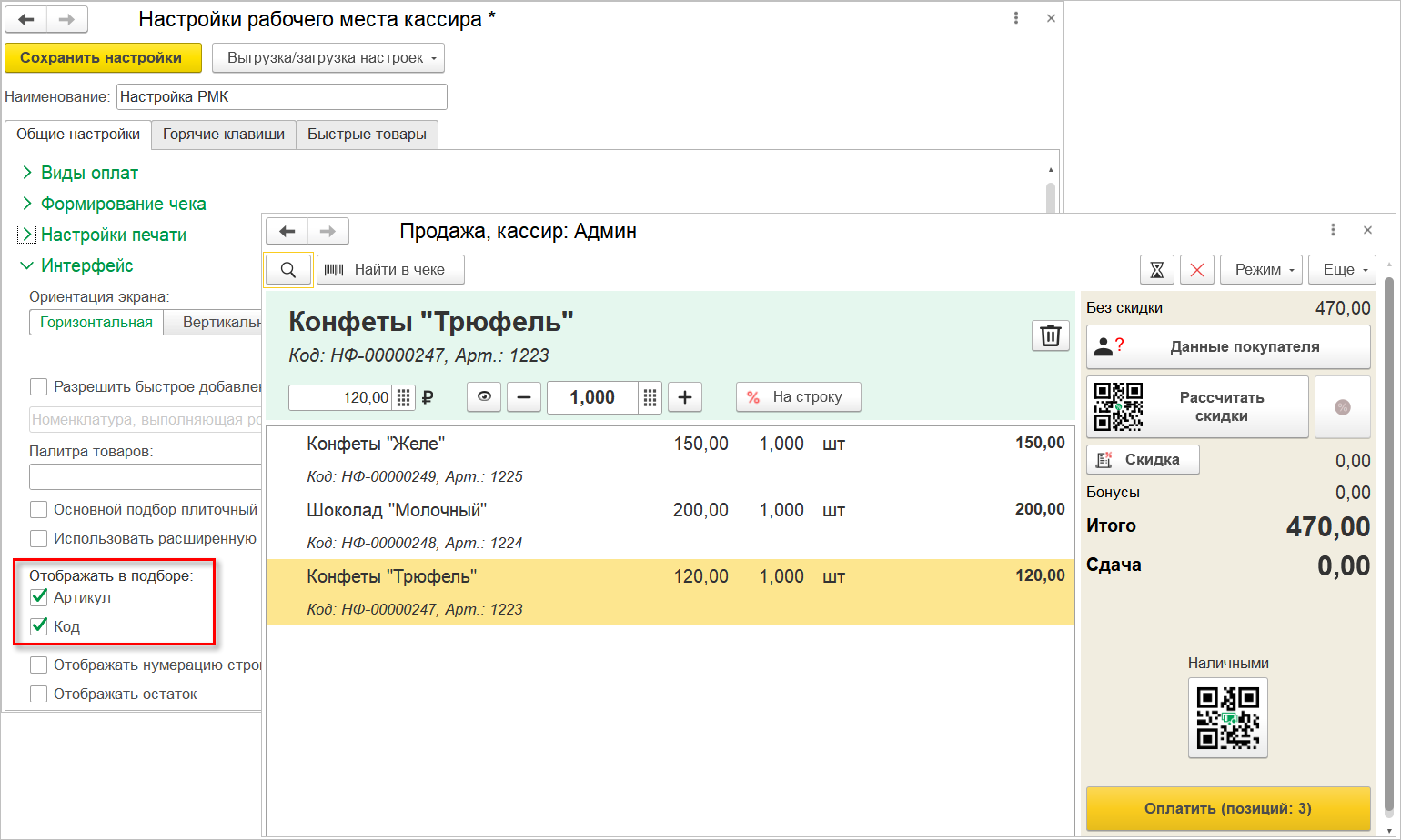 Сделали удобнее работу с артикулами и кодами товаров, теперь можно видеть эти реквизиты не только при подборе товаров, но и в самой корзине. Для этого в разделе "Интерфейс" настроек РМК нужно установить соответствующие флажки.