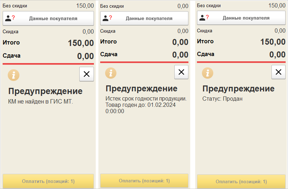 Также предупреждение будет выведено, если статус марки не пройдет проверку в "Честном знаке".
