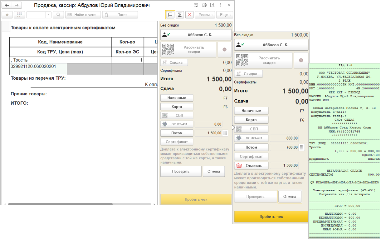 Можно проверить сертификат и совершить оплату с видом расчета "Предоплата", либо "Предоплата 100%", если покупка оплачена полностью сертификатом без доплат.