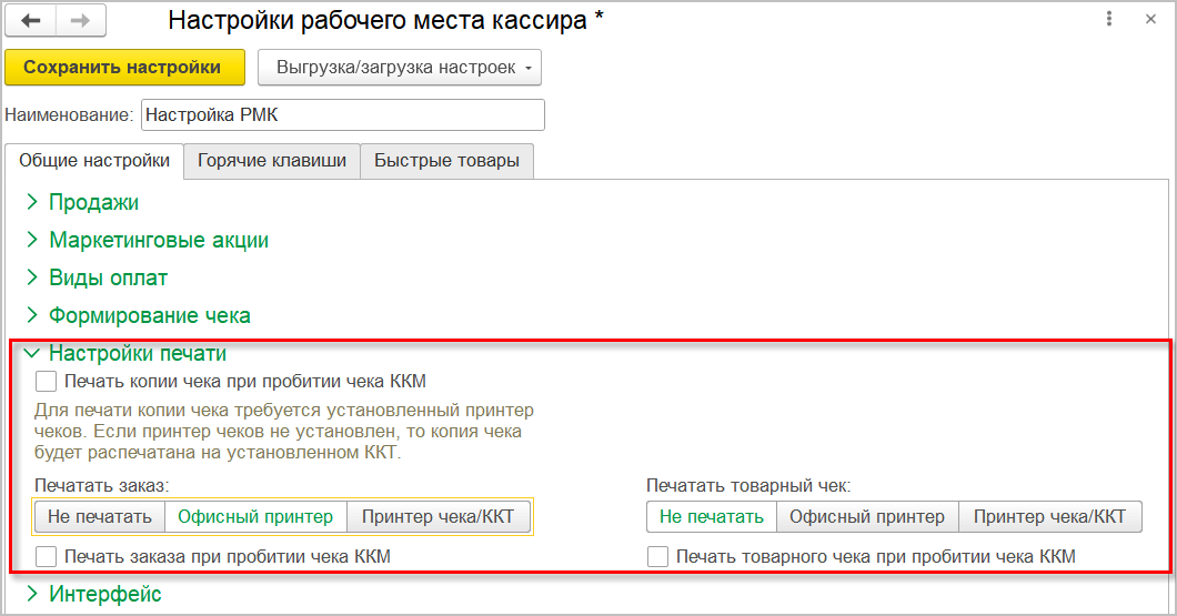В настройки РМК добавлена новая группа "Настройки печати", где доступны