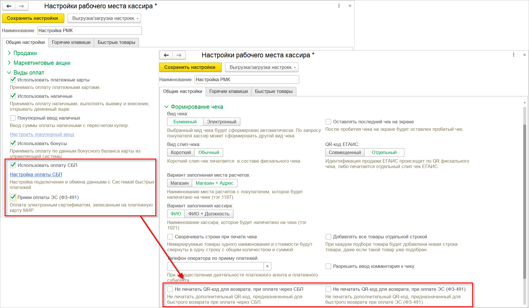 В чеке теперь можно регулировать вывод QR-кода для быстрого возврата товаров, оплаченных с помощью СБП или ЭС (ФЗ-491). Для этого в раздел "Формирование чека" добавлены одноименные опции. Их доступность зависит от используемых видов оплат.