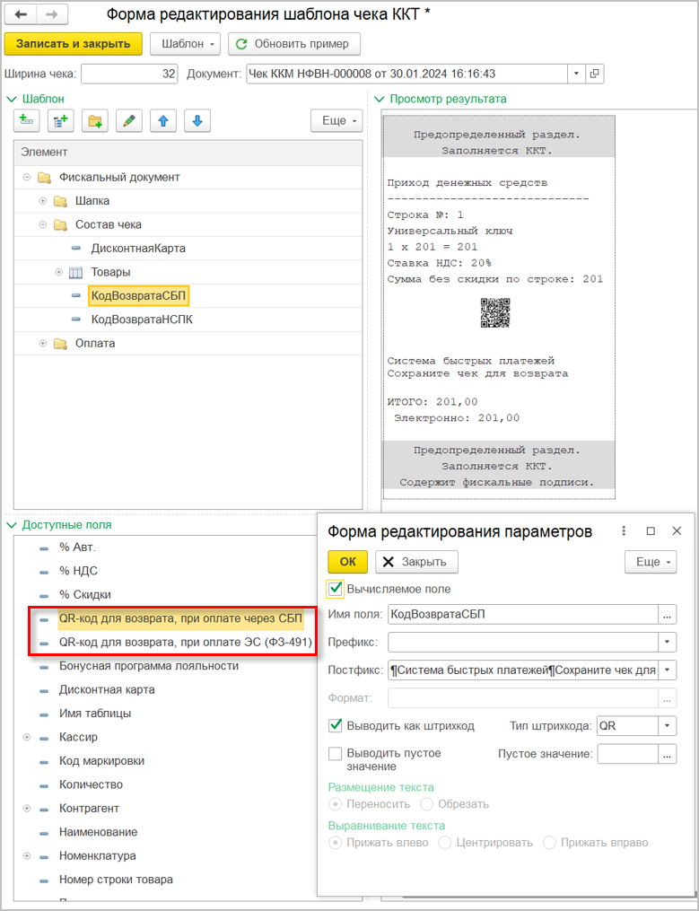 QR-код для возврата можно отображать и при использовании шаблона печати чека продажи. Для этого в шаблоне предназначены новые поля: "QR-код для возврата, при оплате через СБП» и «QR-код для возврата, при оплате ЭС (ФЗ-491)».