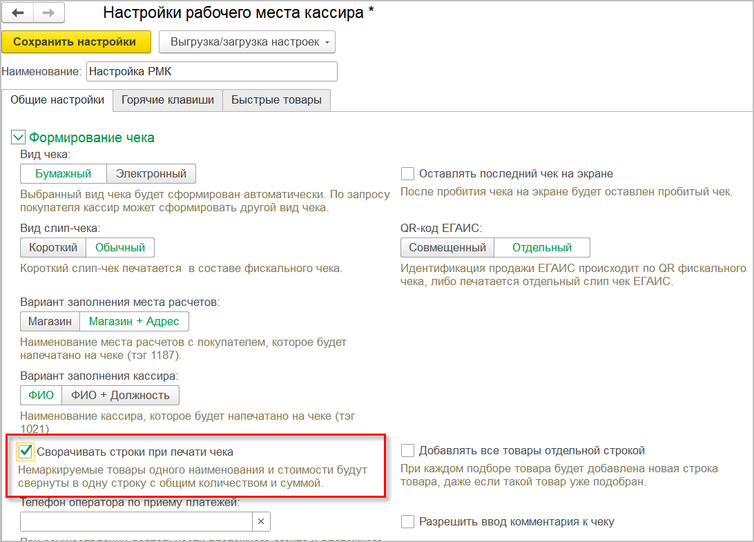 Одинаковые маркируемые товары будут объединены в одну позицию в чеке. Это регулируется флажком "Сворачивать строки при печати чека" в разделе "Формирование чека" настроек РМК. Объединение позиций действует только на печатную форму чека. В электронной форме объединение не действует. В форме РМК позиции также будут отображаться раздельно. Это позволит экономить бумагу при пробитии, значительно сокращая размер чека.