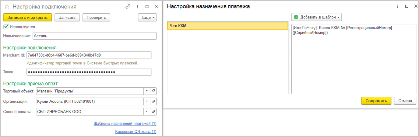 Расширены параметры шаблона назначения платежа СБП. Добавлена возможность указывать регистрационный номер Кассы ККМ и серийный номер подключаемого оборудования. Настройка производится на форме настройки подключения по ссылке "Шаблоны назначений платежей". Здесь можно заполнить шаблон для каждого вида документа.