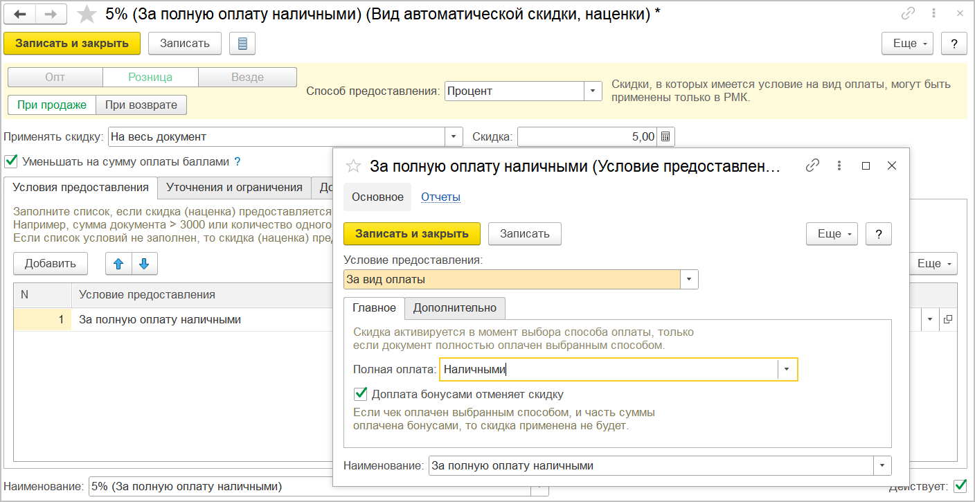 Добавлена возможность предоставить покупателю скидку за использование наиболее выгодного для компании способа оплаты. Для этого в управляющей программе нужно настроить скидку "Процент" или "Сумма" с видом условия предоставления "За вид оплаты" и указать конкретный способ оплаты: наличными, банковской картой или СБП. Скидка сработает только за оплату всей покупки одним из способов. Но флажок "Доплата бонусами отменяет скидку" определяет, можно ли настроить исключение, оплатив часть покупки бонусами, при этом сохранив скидку.