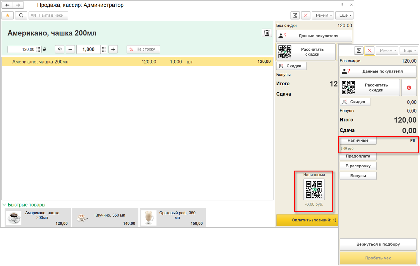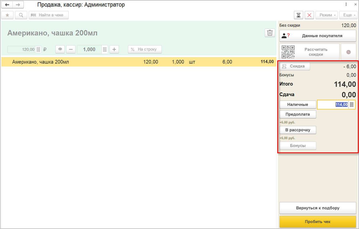 Если скидка за вид оплаты уже применена, но добавить оплату еще другим способом, то право на применение скидки за вид оплаты будет потеряно. В таких случаях, напротив видов оплаты, которые отменяют скидку, выводится подсказка с суммами, насколько увеличится чек, если добавить этот вид оплаты.