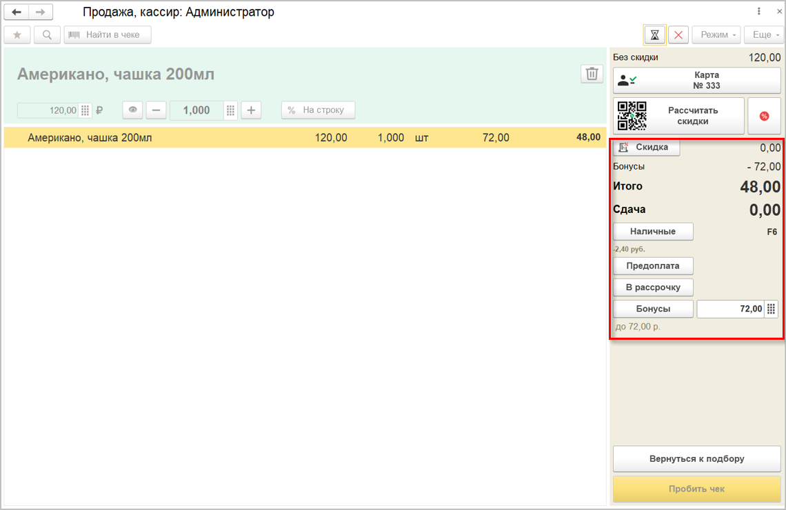 На рисунке ниже сумма скидки за вид оплаты рассчитывается 48 руб., то есть