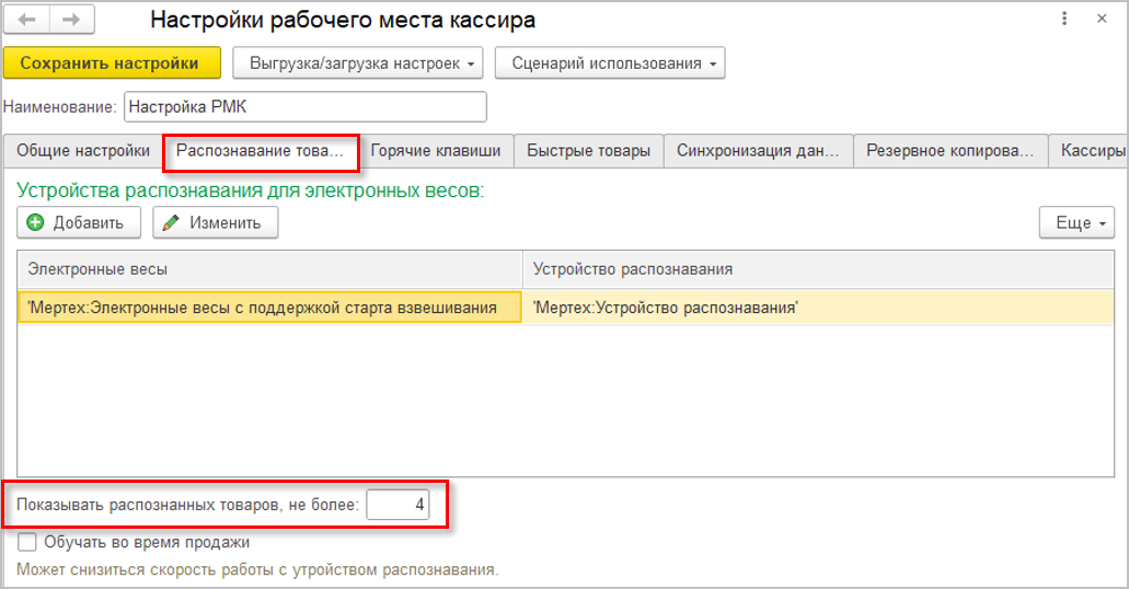 В настройках РМК на закладке "Распознавание товаров" потребуется указать "связку" – какое устройство распознавания, к каким электронным весам относится. Здесь же можно ограничить количество выводимых на форму РМК распознанных товаров, оставляя наиболее вероятные.