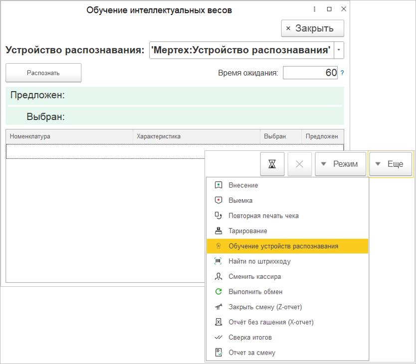 Сотрудники могут обучать устройство распознавания в специальной форме. Если у кассира есть соответствующая роль, то в меню "Еще" будет доступна команда для открытия данной формы. Показатель "Время ожидания" - значение из настроек подключаемого оборудования, определяющее, сколько времени устройство распознавания ожидает подтверждения после распознавания.