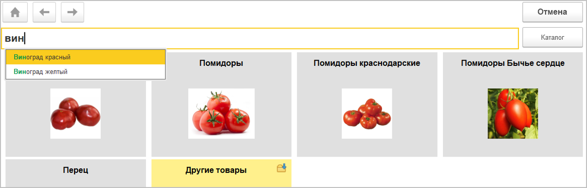 По кнопке «Распознать» будет отправлен запрос на распознавание. При успешном распознавании откроется плиточный каталог с распознанными товарами. Если среди них нет подходящего, пользователь может найти нужный товар в папке «Другие товары», отсканировав штрихкод товара или в строке быстрого поиска. Последние два варианта поиска предназначены для работы с товарами без характеристик. Также можно выбрать товар, открыв каталог по соответствующей кнопке. Весовому товару должен быть присвоен код SKU, который необходим для передачи данных в устройство распознавания.