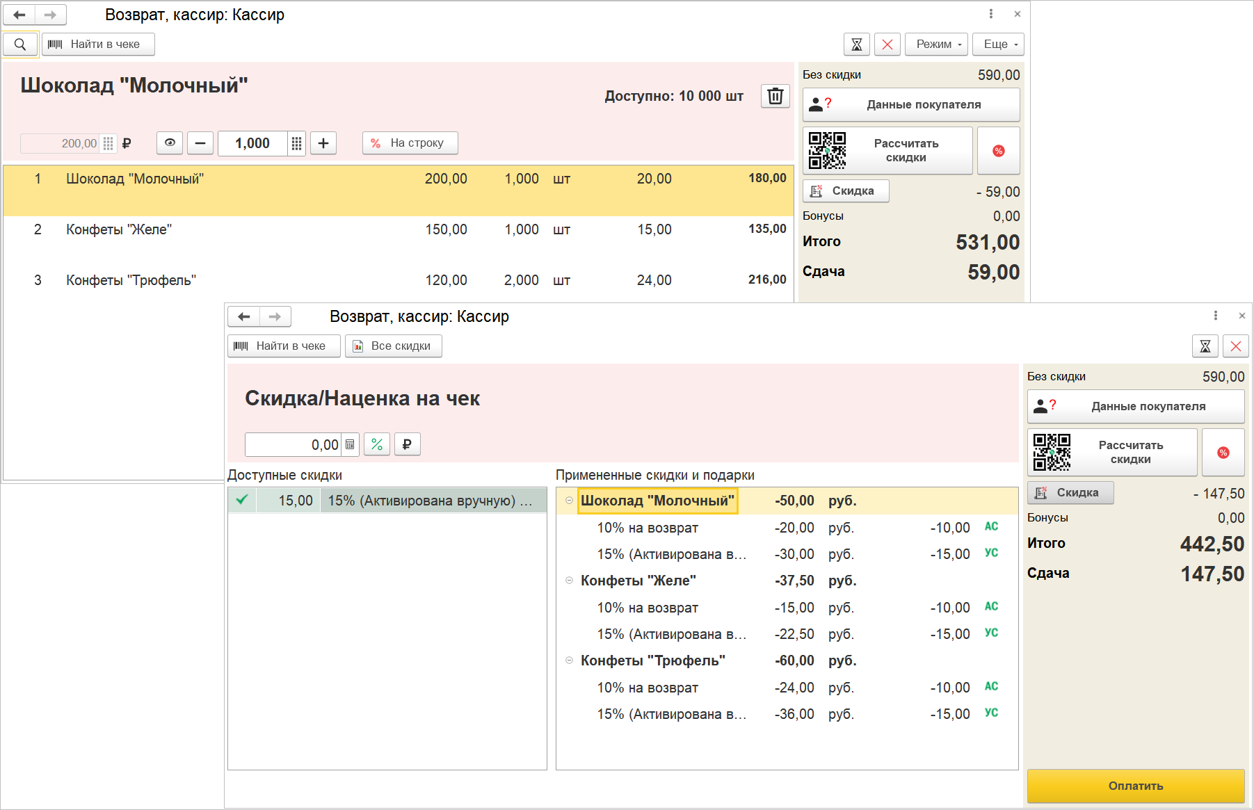 Скидки применяются как на чек возврата на основании, так и без основания. Если возврат создан на основании чека продажи, в котором были рассчитаны автоматические скидки, то данные о рассчитанных скидках продажи сохраняются в чеке возврата.